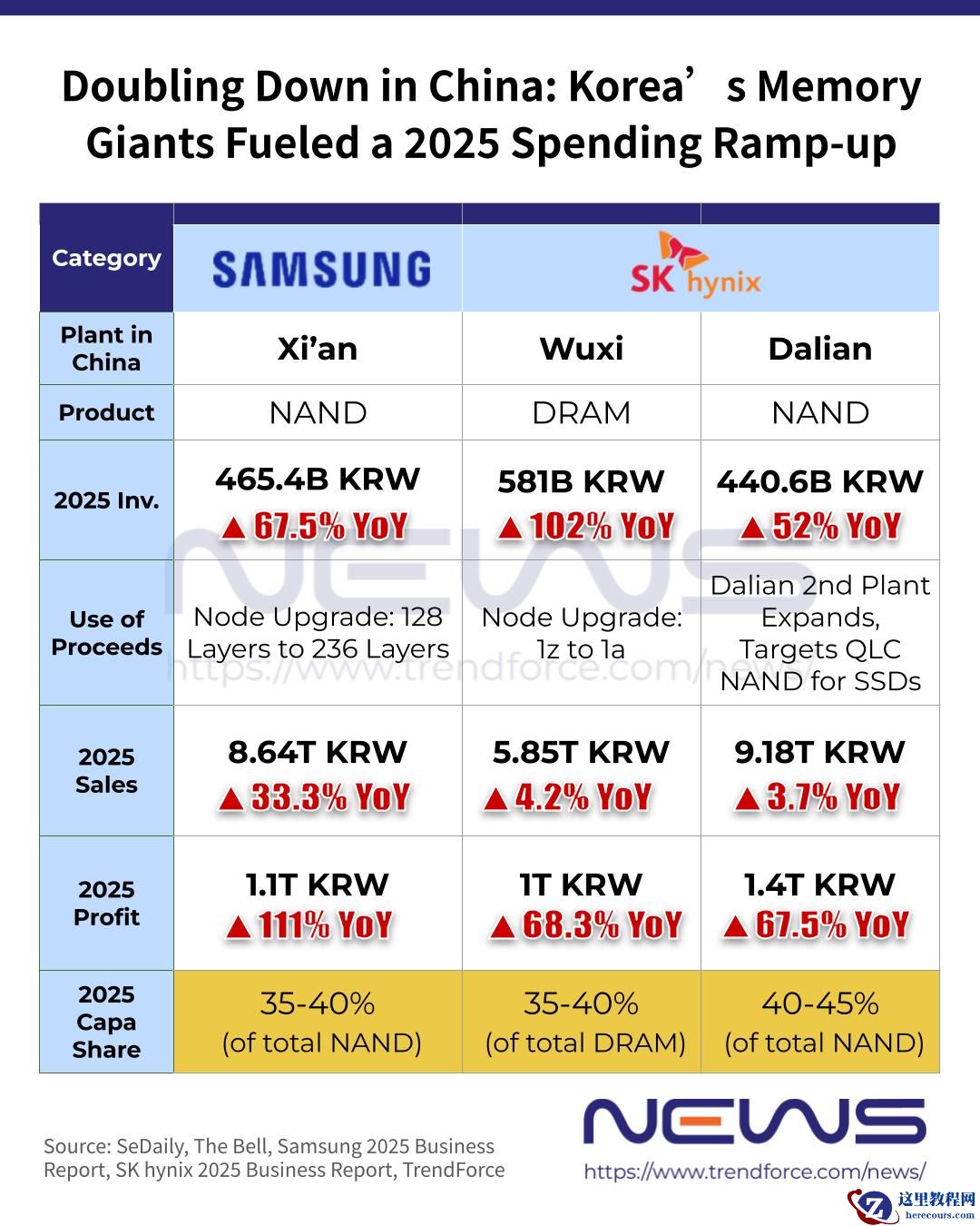 3 月 27 日消息,集邦咨询 TrendForce 昨日(3 月 26 日)发布博文,报道称面对全球存储芯片需求爆发,基于 2025 年财报数据,三星与 SK 海力士双双大幅增加对中国工厂的投资,进一步凸显了中国产能的关键地位。