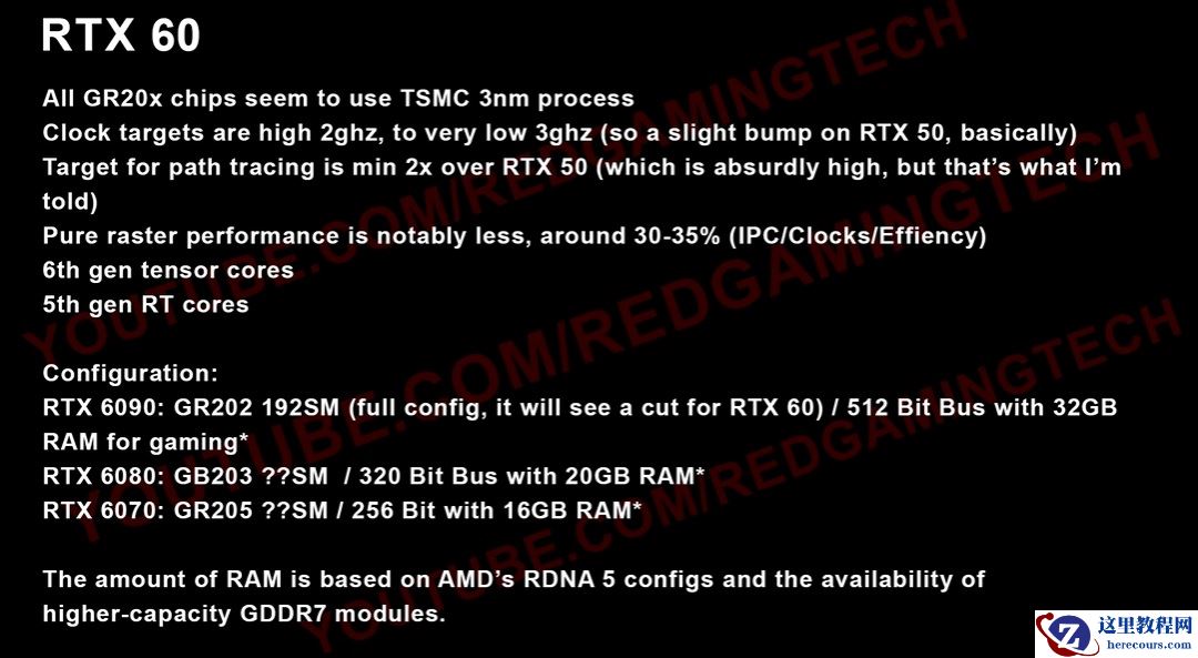 3 月 27 日消息,YouTube 频道 Red Gaming Tech 在最新一期视频中,爆料称相比较 RTX 50 系列,英伟达 RTX 60 系列显卡纯光栅性能提升约 30~35%,路径追踪性能目标实现 2 倍提升。
