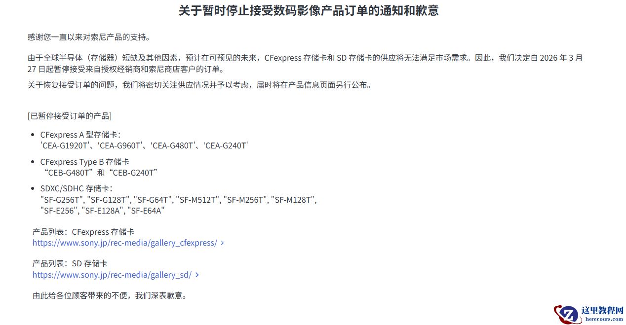 索尼在公告中表示:“感谢您长期以来对索尼产品的支持。由于全球半导体(存储器)短缺及其他因素影响,预计在可预见的未来,CFexpress 存储卡及 SD 存储卡的供应将无法满足市场需求。因此,我们决定自 2026 年 3 月 27 日起,暂时停止接受授权经销商及索尼商店客户的订单。关于恢复接单的时间,我们将在监控供应情况的同时进行考虑,并将在产品信息页面另行公告。”