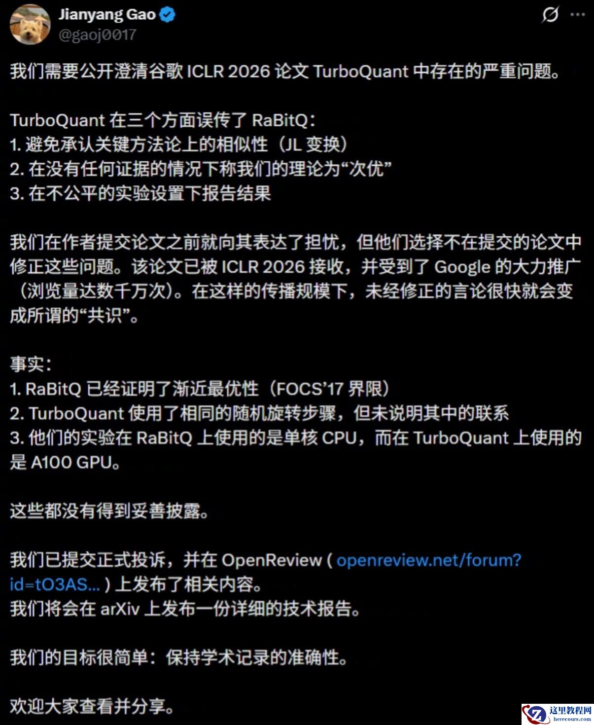 高健扬指出,团队在作者提交论文之前就向其表达了担忧,但他们选择不在提交的论文中修正这些问题。该论文已被 ICLR2026 接收,并受到了谷歌的大力推广(浏览量达数千万次)。在这样的传播规模下,未经修正的言论很快就会变成所谓的“共识”。