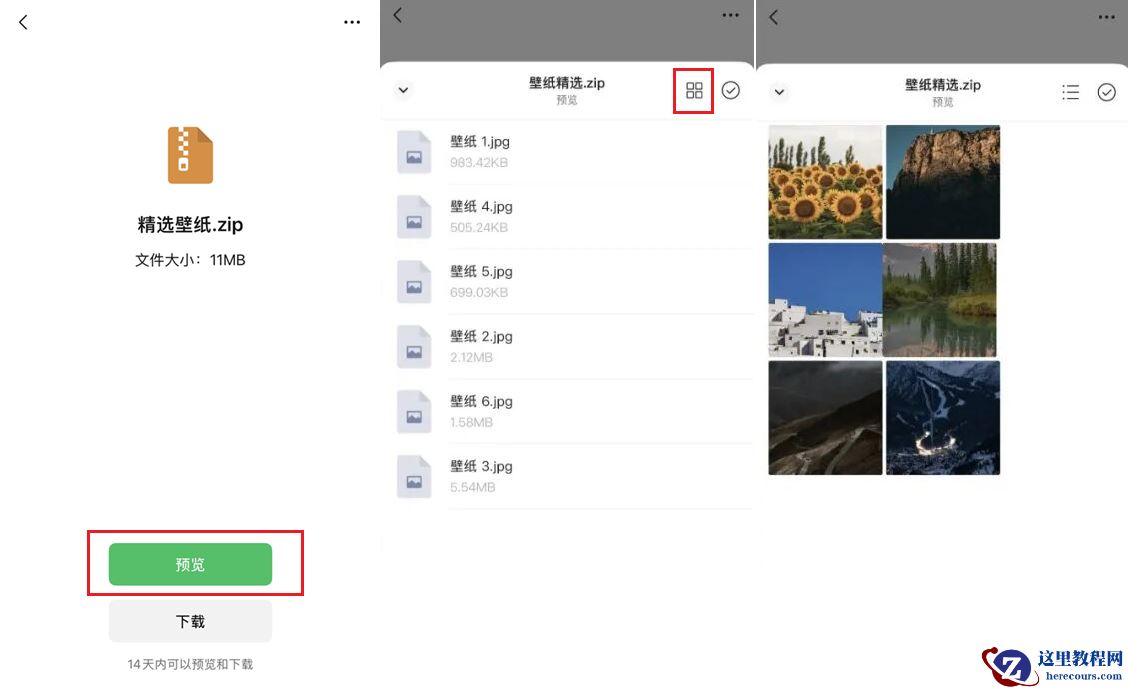 拥有灰度测试资格的用户现在再点击聊天界面中的压缩文件后,会发现底部新增了“预览”按钮,点击即可查看压缩包内文件列表,支持以列表或缩略图形式浏览,并可选择单个或多个文件进行转发、收藏或下载,无需下载整个压缩包。