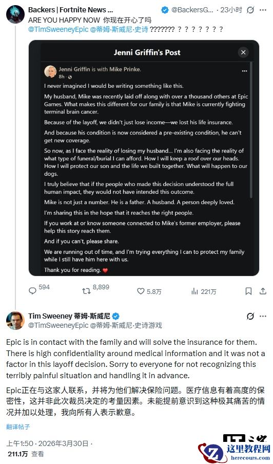 3 月 30 日消息,Epic 游戏公司首席执行官蒂姆 · 斯威尼将介入并帮助一名遭遇不幸的被解雇员工,该员工患有晚期脑癌,且在公司裁掉其职位后失去了人寿保险。
