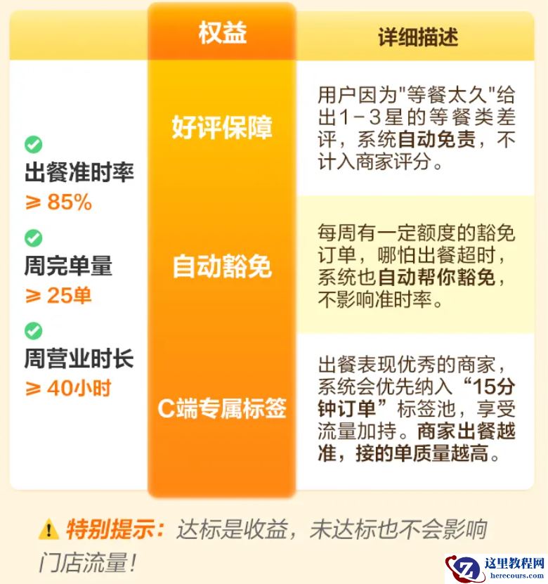 美团外卖官方表示,功能目的是鼓励商家准时出餐,达标就给权益;未达标,也不会影响门店流量,是一个纯粹的“有奖无罚”机制 —— 商家只有收益,没有风险。