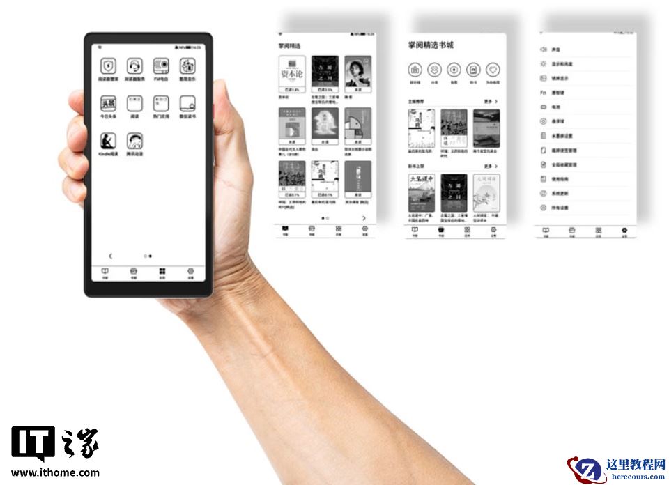 该机采用手机造型,整体厚度 7.5mm,重量 177g,中框采用磨砂工艺。正面配备一块 6.7 英寸 300PPI 黑白墨水屏,提供 36 级 DC 调光。