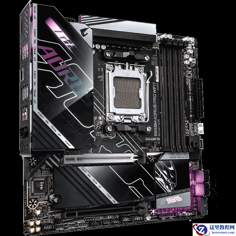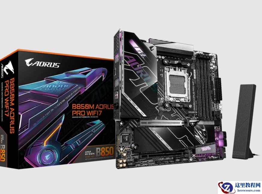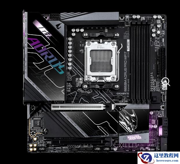 除了上面这款,还有技嘉 B850M AORUS PRO WIFI7 电竞雕主板也可以考虑(下面简称技嘉 B850M 电竞雕)。这款主板为 24.4X24.4CM 标准 MATX 设计,整体是纯黑主题打造,在 I/O 和 PCH 区域做了黑镜处理,高级感迎面而来,颜值很高。