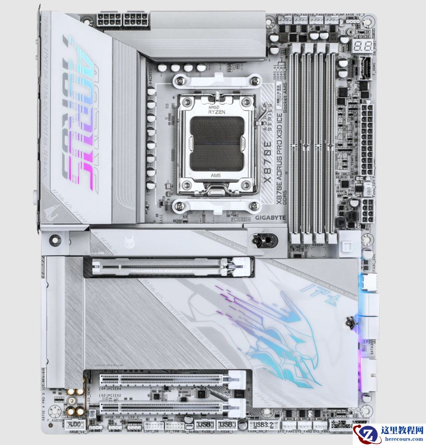 具体来说,这款主板采用标准 ATX 板型,支持 AM5 接口处理器。在颜值上,其延续了冰雕系列的风格,从内存插槽、供电接口、散热装甲以及到 PCB 板身,都是银白色。散热装甲表面混合了拉丝、磨砂、镜面等多种处理工艺,下方和左上方还有 AORUS 及雕首 LOGO 标识,颜值颇高。