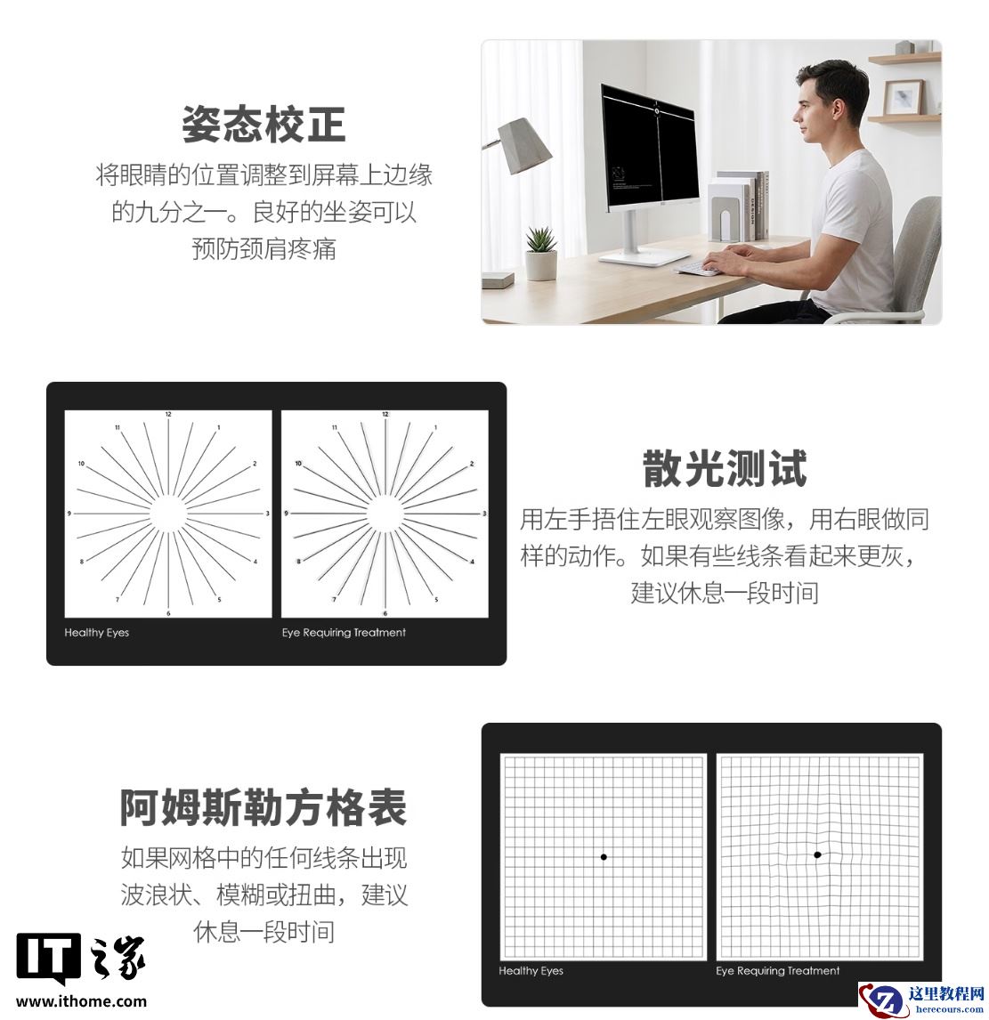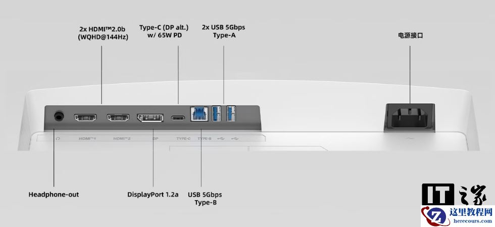 该显示器还内置了多项用眼自查功能,帮助校正姿态、测试散光等;搭载 USB-C 接口(支持 65W 供电),集成 KVM 切换器。