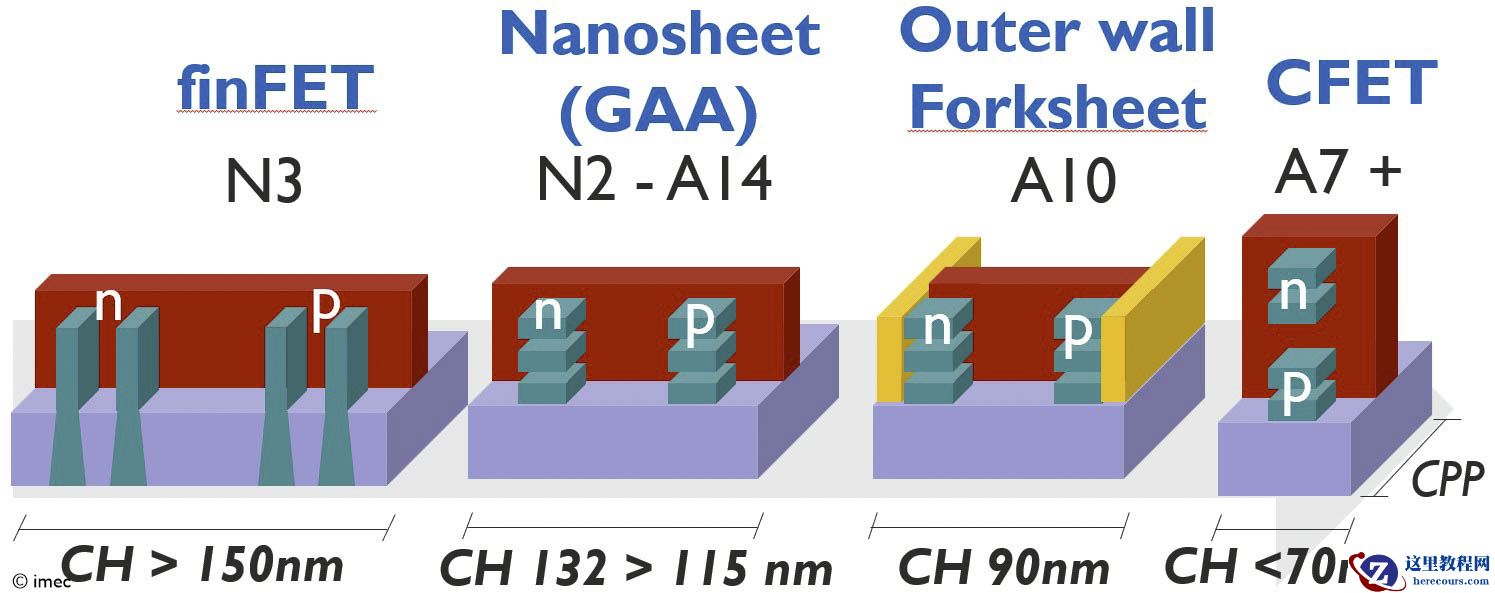 报道指出,SF1.0 将采用 forksheet 叉片晶体管器件结构,这是现有 nanosheet GAA 全环绕栅极晶体管的演化。其在标准 GAA 的基础上新增介质壁,可进一步提升晶体管密度与性能,该结构又分为“内壁”与“外壁”两种类型。
