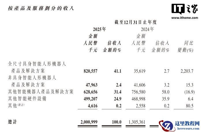 其中,全尺寸具身智能人形机器人产品及解决方案成为最大收入来源,全年贡献收入 8.21 亿元,同比增幅高达 2203.7%。该业务在 2025 年实现销量 1079 台,同比增长超过 358 倍,标志着其从技术验证阶段正式迈入规模化商业应用。
