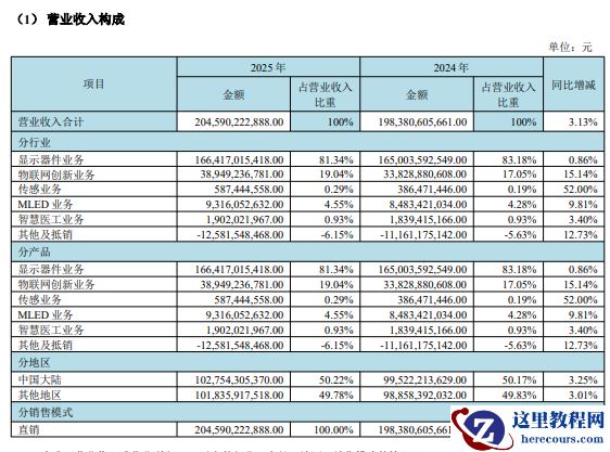 从主营业务板块来看,作为核心的显示器件业务全年营收约 1664.17 亿元,同比增长 0.86%,其 LCD 五大主流应用及车载应用面板出货量继续稳居全球第一,柔性 OLED 器件出货量保持稳定增长。物联网创新业务表现亮眼,营收约 389.49 亿元,同比增长 15.14%,成为推动公司增长的重要动力。此外,传感业务、MLED 业务和智慧医工业务分别实现营收约 5.87 亿元、93.16 亿元和 19.02 亿元,同比增幅分别达到 52.00%、9.81% 和 3.40%,各细分赛道均呈现良好发展态势。