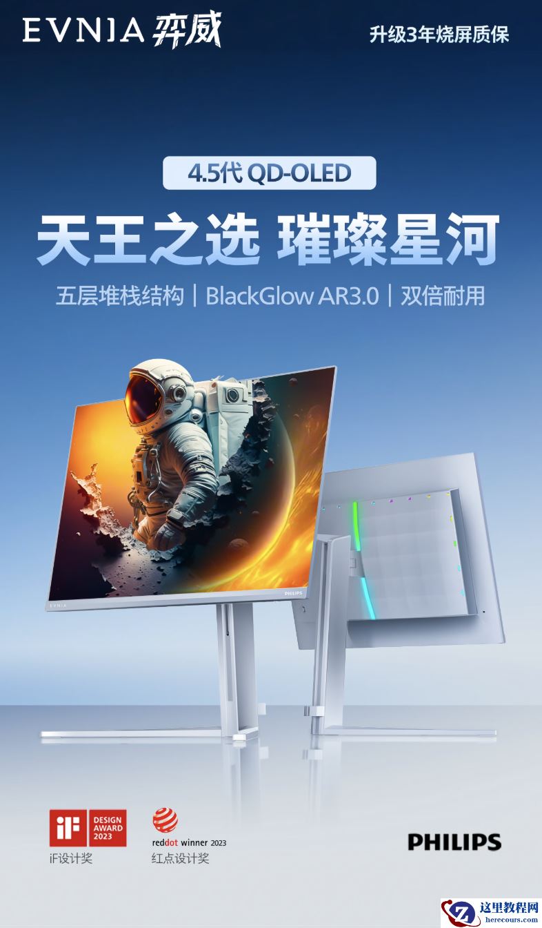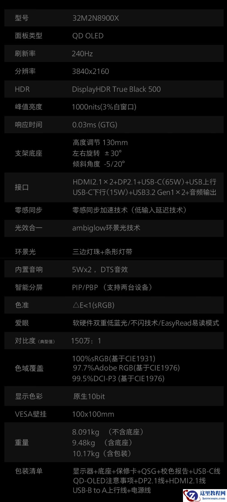 该机配备一块 3840x2160 分辨率 240Hz QD-OLED Penta Tandem 面板,辅以 BlackGlow AR 3.0 零雾度光学层,号称相对上一代环境光反射减低 40%。其 HDR 峰值亮度 1000 尼特,GtG 响应速度 0.03ms,动态对比度 150 万:1,显示器支持原生 10-Bit 色彩,覆盖 99.5% DCI-P3 色域。