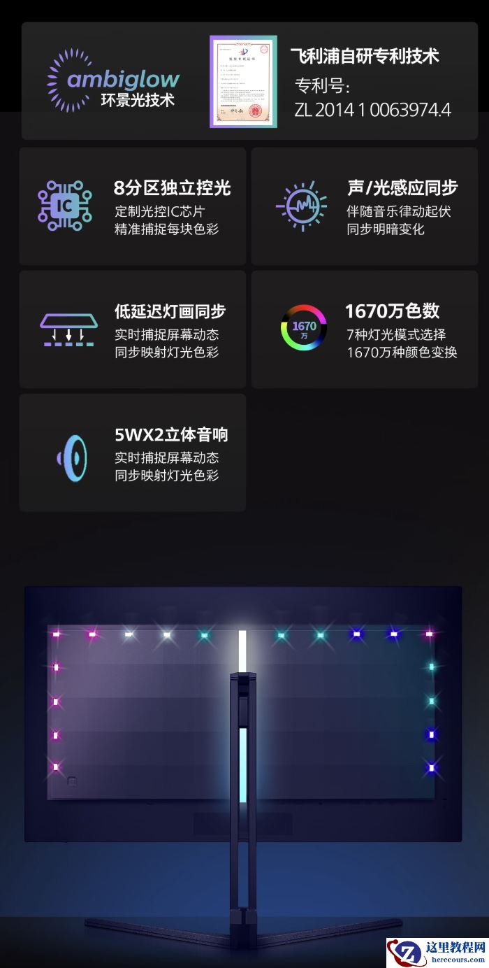 该机使用钛空银色边框 / 支架,其中支架部分集成耳机挂架,同时允许显示器本体实现升降 / 倾斜 / 旋转。显示器带有 RGB 氛围灯,同时集成双 5W 扬声器。