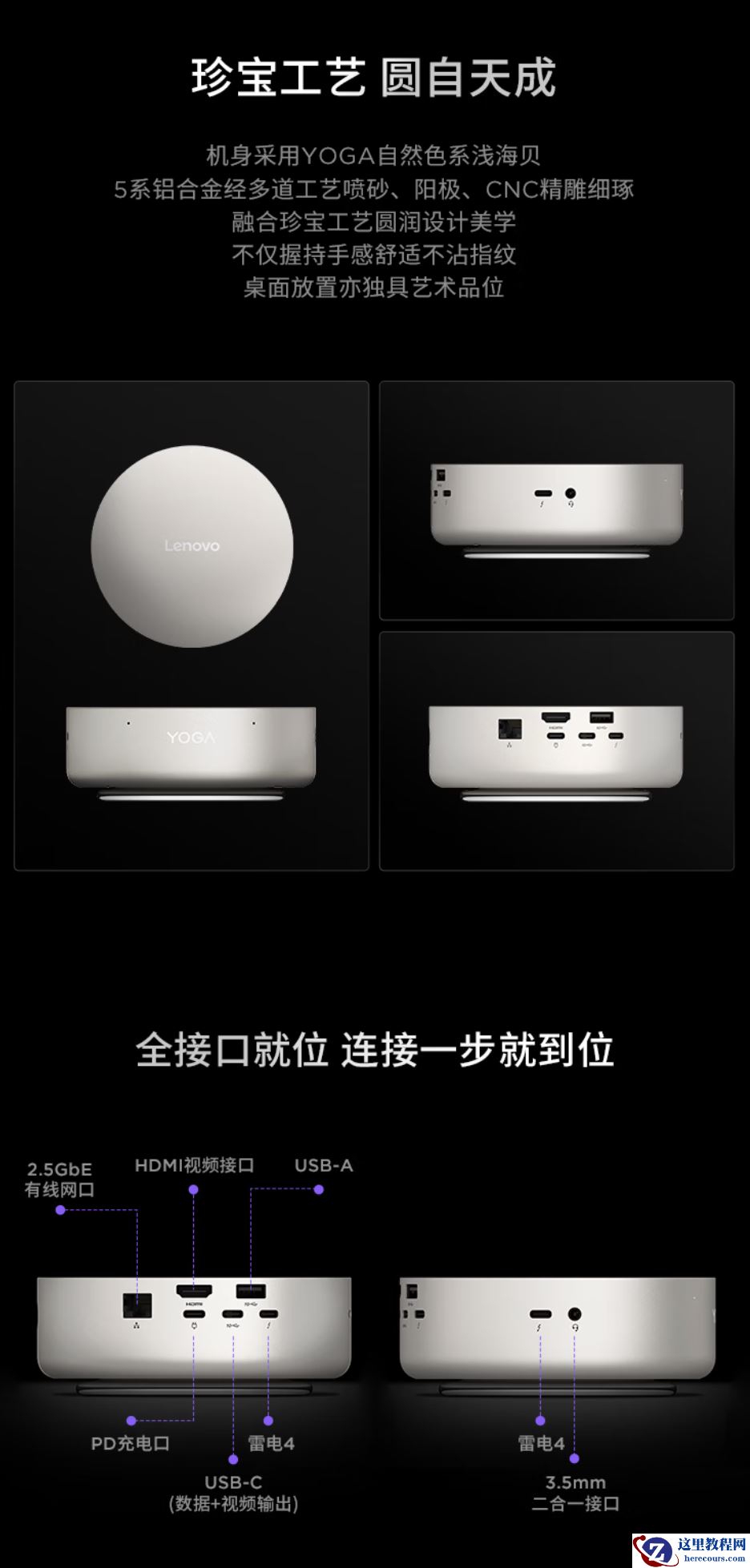 该机采用圆柱形造型,机身使用浅海贝配色,整体重量 600g,容积约 0.65L。机身左侧配备 1 个雷电 4 接口、1 个 3.5mm 音频接口;背面配备 1 个 2.5G 网口、1 个 HDMI 接口、1 个 PD 充电口、1 个 USB-C 接口、1 个雷电 4 接口。