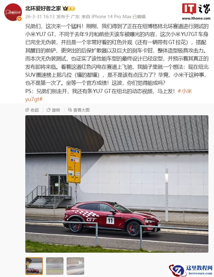 10、小米 YU7 GT 无伪装实车曝光:红色外观 + GT 拉花、配巨大刹车卡钳,正在纽北赛道进行测试