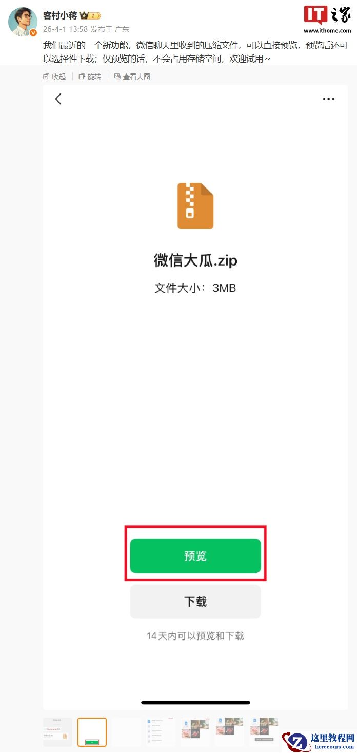 微信员工 @客村小蒋 今日发文谈及了这项新功能。他表示,微信聊天里收到的压缩文件,可以直接预览,预览后还可以选择性下载;仅预览的话,不会占用存储空间。