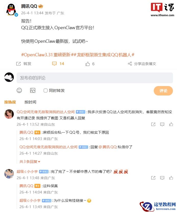 4 月 1 日消息,腾讯 QQ 官方微博今日宣布,QQ 正式原生接入 OpenClaw 官方平台。