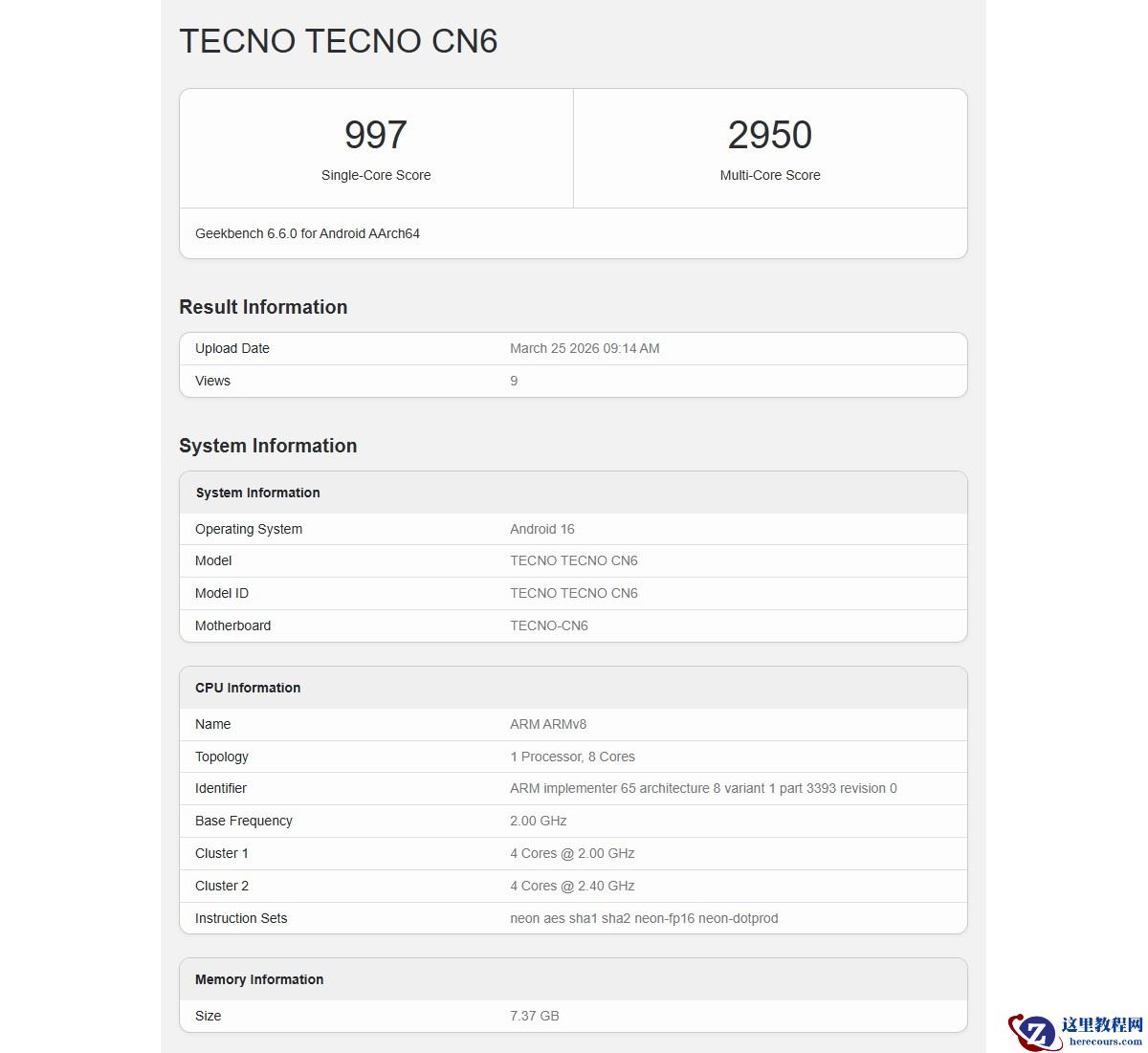 根据 Geekbench 跑分库披露的测试数据,该机在 6.6.0 版本中单核成绩为 997 分,多核成绩为 2950 分,页面显示该机配备联发科天玑 7100 处理器,配合 8GB 运行内存。