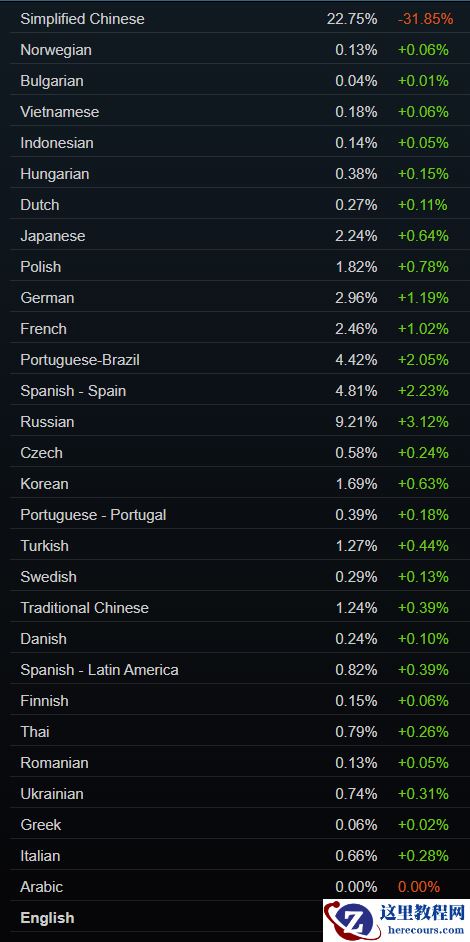 注意到,简体中文玩家占比由 2 月的一半以上降到了 22.75%,英语重新成为 Steam 第一大语言。