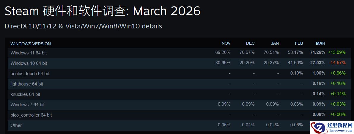 系统方面,Windows 11 系统份额回升到 71.26%(仅统计 Windows 系统),Windows 10 份额大幅下滑到 27.03%。