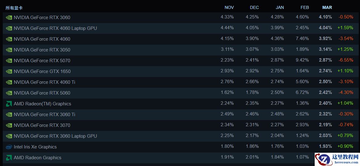 显卡方面,RTX 4060、RTX 5070、RTX 4060 Ti、RTX 5060 这四款显卡的份额在 3 月大幅下降,推测是春节过后网吧用机调查数量减少所致。