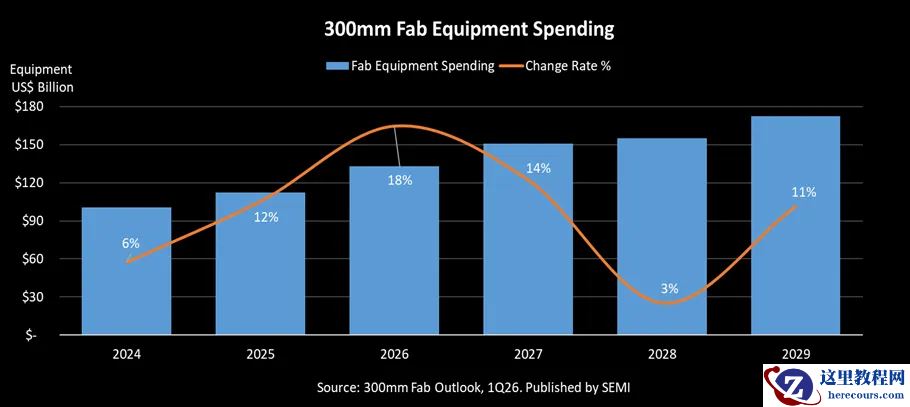 4 月 2 日消息,国际半导体产业协会 SEMI 昨日表示,2026~2029 年全球 300mm(12 英寸)晶圆厂设备支出将持续增长,增幅分别为 18%、14%、3%、11%,分别达到 1330 亿美元、1510 亿美元、1550 亿美元、1720 亿美元。