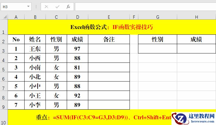 1、在目标单元格中输入公式:=SUM(IF(C3:C9=G3,D3:D9))。