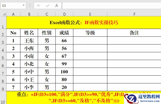 在目标单元格中输入公式:=IF(D3=100,”满分”,IF(D3>=90,”优秀”,IF(D3>=80,”良好”,IF(D3>=60,”及格”,”不及格”))))。