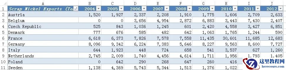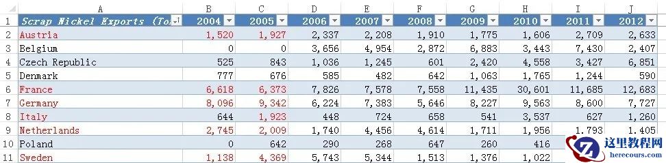 在这篇文章中,探讨一种计算在至少一列中满足规定条件的行数的解决方案,示例工作表如下图1所示,其中详细列出了各个国家在不同年份废镍的出口水平。