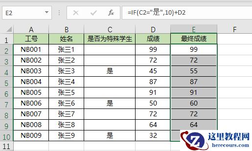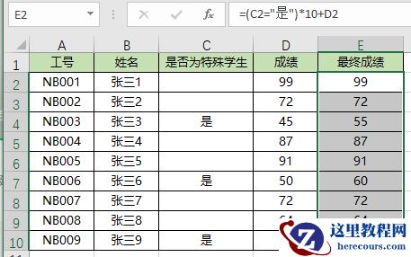 如果下图中的“是否为特殊学生”这一列中为是,那么给成绩整体加10分,否则为原来的成绩。