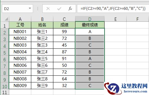 这个公式是最外面是判断的是90分的,如果大于等于90分,那么是A,否则,也就是不大于90分的时候,再看是不是大于60,如果大于60,那么就为B,如果不大于60,即小于60,那么就为C.