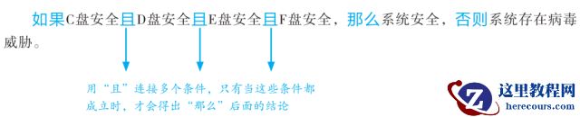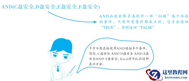 Excel中的AND函数就是用来代替人类语言中的“且”,连接多个条件的函数,如“C盘安全且D盘安全且E盘安全且F盘安全”可以改写为: