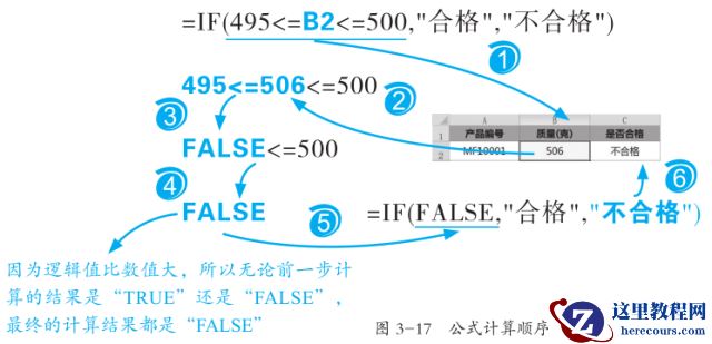 在Excel的眼中,“<=”是比较运算符,它同数学运算符“+”没有太大的区别。当Excel面对“495<=B2<=500”时,会像对待“3+2+5”一样,将它看成是一个进行两次比较运算的表达式,并按计算法则规定的先后顺序计算它,如图所示。