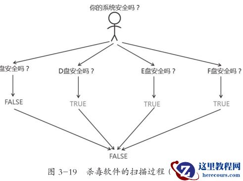 在这个例子中,必须满足4个条件(C盘安全,D盘安全,E盘安全,F盘安全),杀毒软件才会提示系统安全,只要其中某个条件不成立,杀毒软件都认为系统存在病毒威胁。