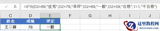=IFS(D2>89,”优秀”,D2>79,”良好”,D2>69,”一般”,D2>59,”合格”,1=1,”不合格”)