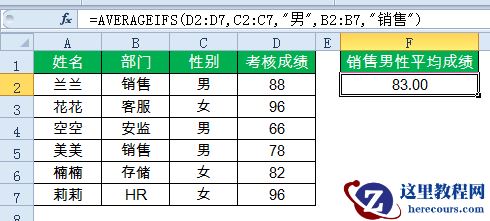 =AVERAGEIFS(D2:D7,C2:C7,”男”,B2:B7,”销售”)
