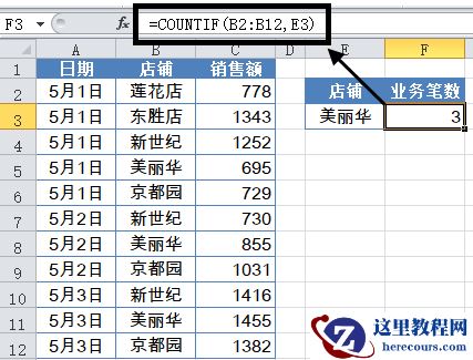 如下图,要统计指定店铺的业务笔数。也就是统计B列中有多少个指定的店铺名称。