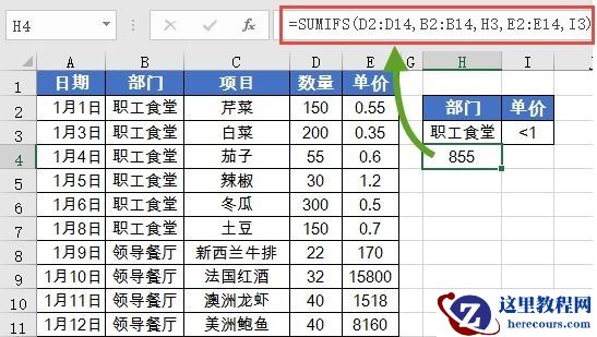 公式的意思是,如果B2:B14单元格区域中等于H3指定的部门“职工食堂”,并且E2:E14单元格区域中等于指定的条件”<1″,就对D列对应的数值求和。