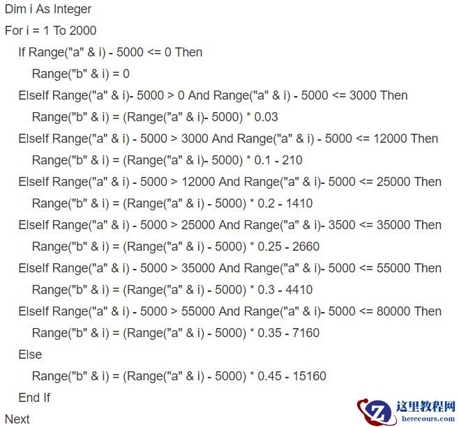 这段代码里面的 Range(“a” & i)和 Range(“b” & i)指的是单元格,这里我假设工资在A列,要计算的个税在B列。