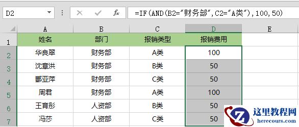 在Excel中,IF函数一般情况下多用于与AND等逻辑函数配合使用。如图所示,财务部的A类员工的报销标准为100元,其他的人员均为50元。