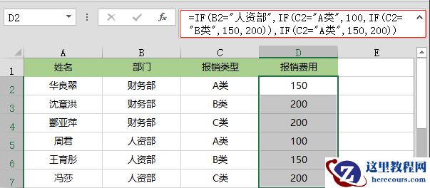 =IF(B2=”人资部”,IF(C2=”A类”,100,IF(C2=”B类”,150,200)),IF(C2=”A类”,150,200))