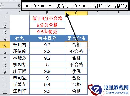 =IF(B5>=9.5,”优秀”,IF(B5>=9,”合格”,”不合格”))