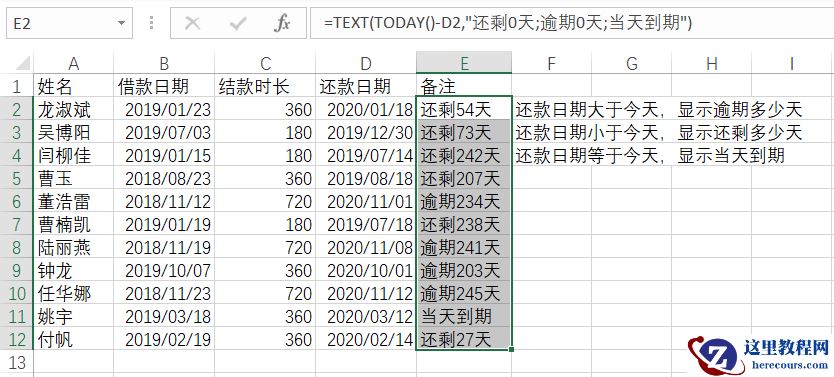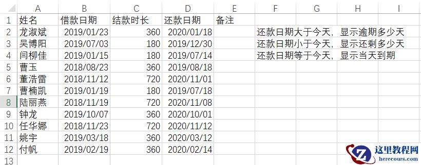 如下图所示,很多人欠了你的钱,你做了一个表格登记,想在备注那里显示逾期情况,是不是又想用IF函数来解决了?