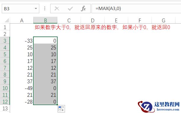 如上图所示,按照要求的逻辑,一般直接想到的就是IF函数,公式就是IF(A3>0,A3,0),其实我们可以换一个方式表达:就是求数字和0之间的最大值。