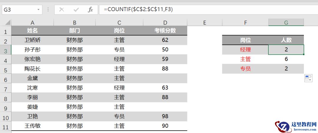 计算下面每个岗位的人数。在G3单元格中输入公式:=COUNTIF($C$2:$C$11,F3)按Enter键完成后向下填充。