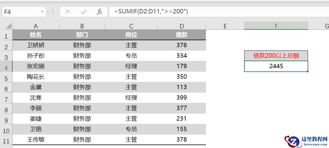 计算下面借款在500以上的总额。在F4单元格中输入公式:=SUMIF(D2:D11,”>=200″)