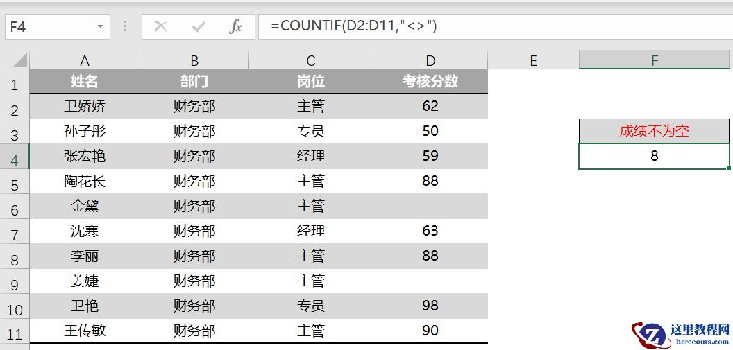 在F4单元格中输入公式:=COUNTIF(D2:D11,”<>”)