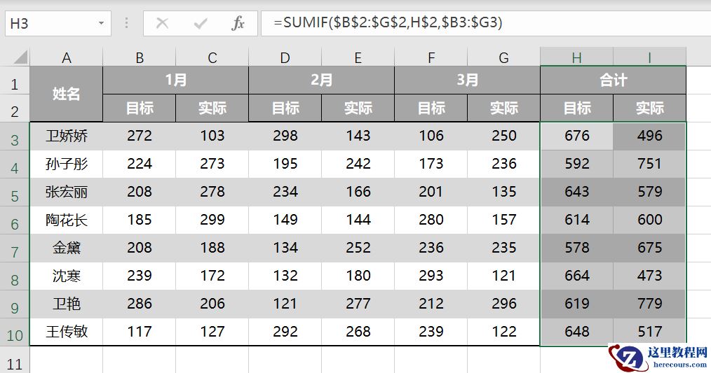 在H3单元格中输入公式:=SUMIF($B$2:$G$2,H$2,$B3:$G3)