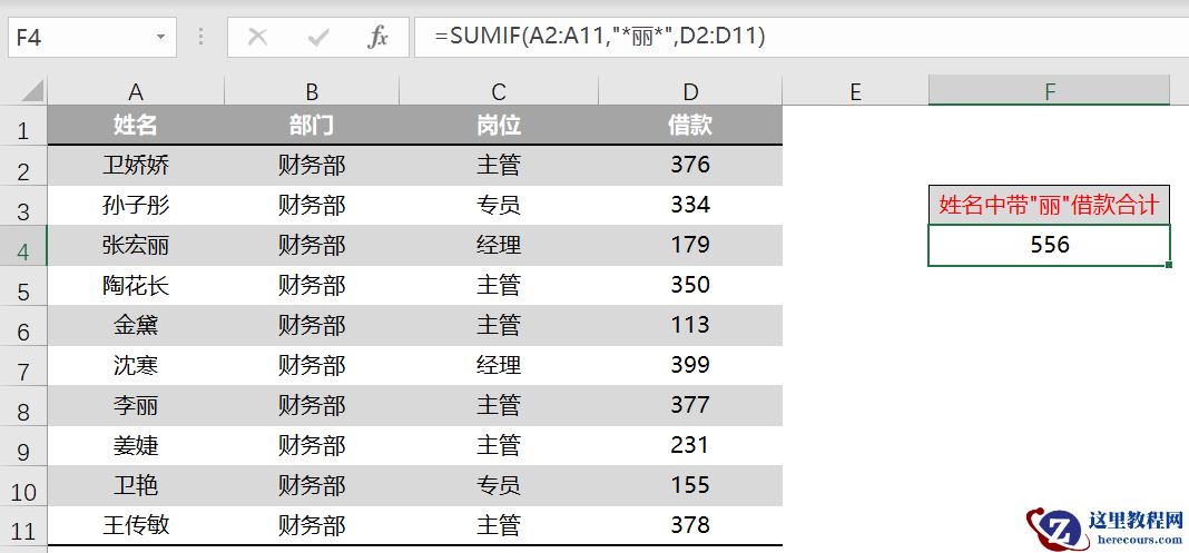 在F4单元格中输入公式:=SUMIF(A2:A11,”*丽*”,D2:D11)