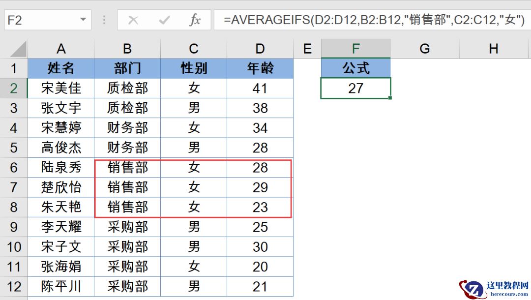 =AVERAGEIFS(D2:D12,B2:B12,”销售部”,C2:C12,”女”)