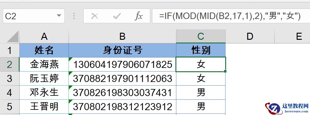 =IF(MOD(MID(B2,17,1),2),”男”,”女”)
